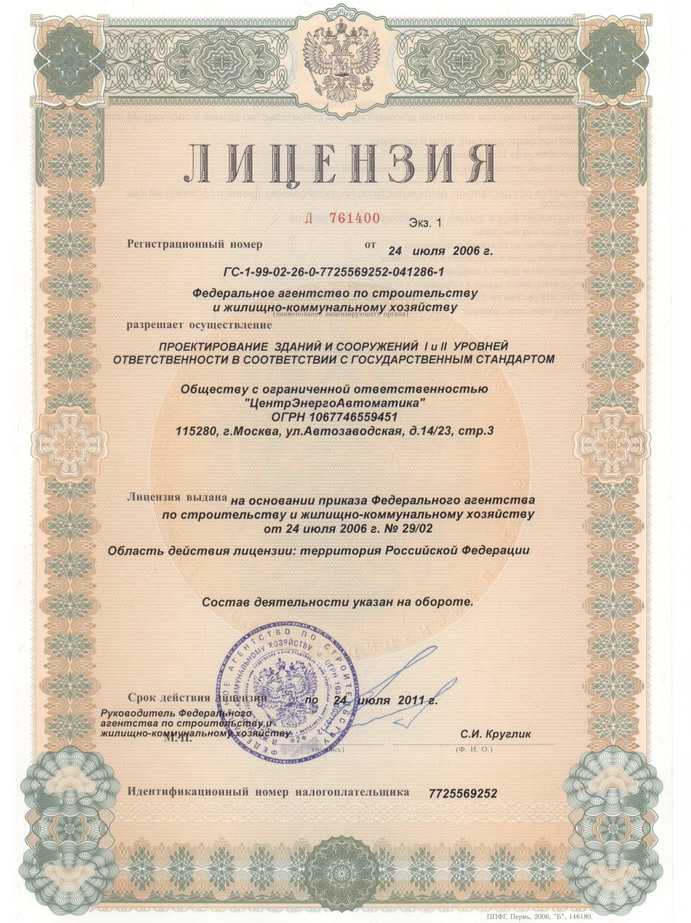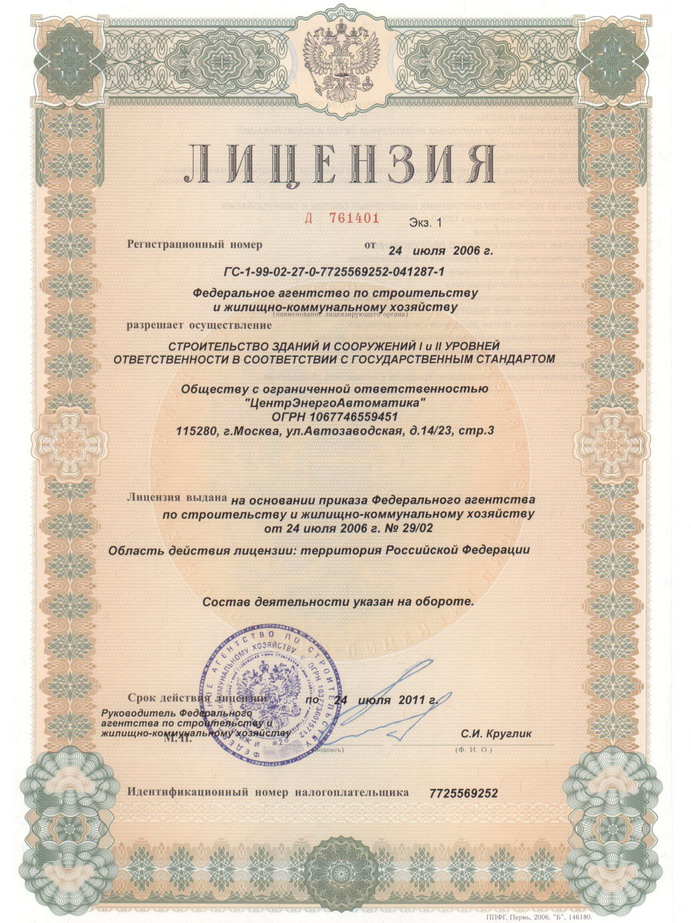 Компания ООО "ЦентрЭнергоАвтоматика" имеет лицензии Федерального агентства по строительству и жилищно-коммунальному хозяйству: